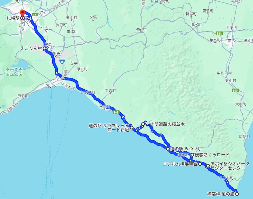 恵庭市から新ひだか町、襟裳岬まで一気に。戻り道で様似町、浦河町、新冠町のルートです。