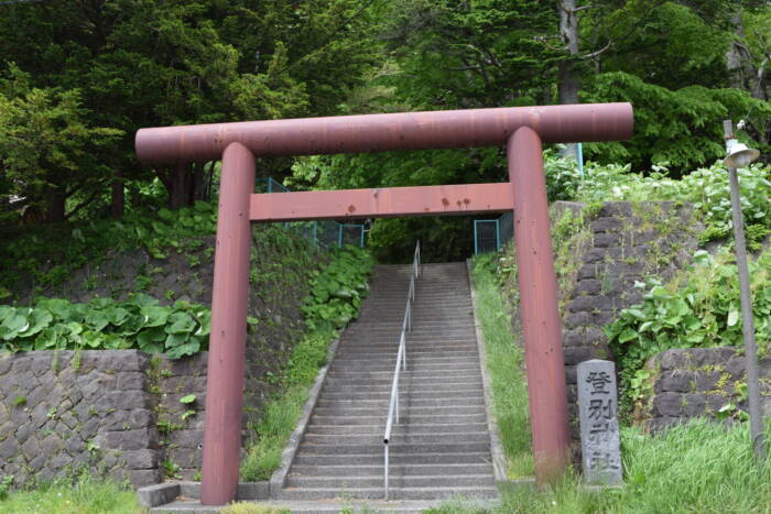 登別神社は、北海道登別市中登別町12番地2に位置しています。登別温泉へ向かう道の国道からの分岐点の近くにあります。
