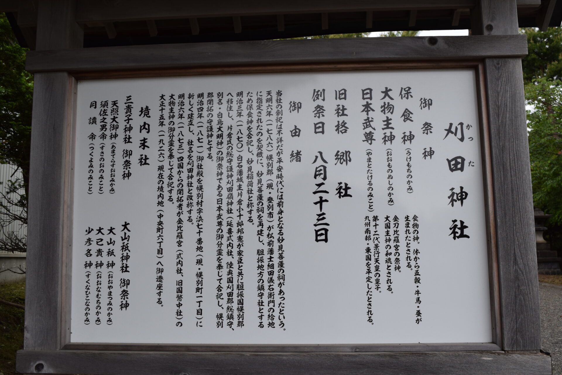 刈田神社の境内は約3,000坪と広大で、社殿は神明造の様式で建てられています。社殿の面積は75坪あり、荘厳な佇まいを見せています。祭神は保食神、大物主神、日本武尊の三柱の神々で、古来より五穀豊穣や商売繁昌、航海安全、国土安穏などの御利益があるとされています。刈田神社は氏子世帯数約6,500世帯を数え、その御朱印やお守りも多くの参拝者に求められています。