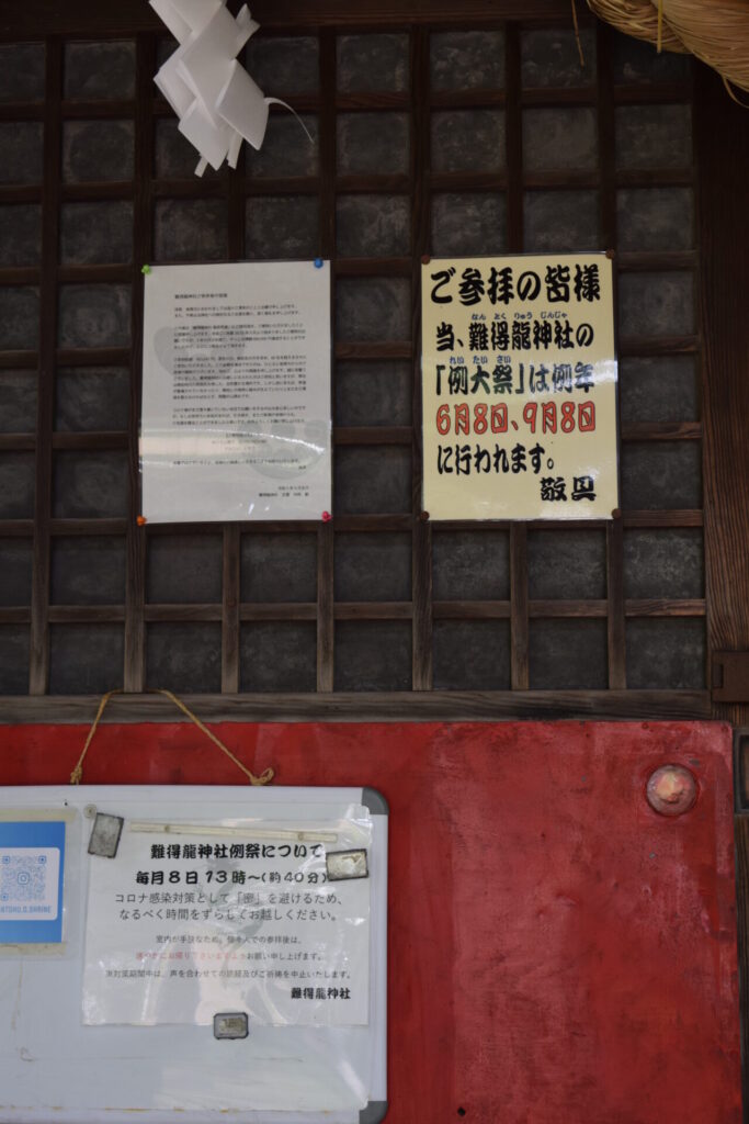 難得龍神社の御祭神は難得大龍神(大竜王神)です。この神様は、日蓮宗の僧から授かったとされ、中西みゆきという女性が怪我を負ったことをきっかけに霊感を自覚し、難得大龍神を祀ることになりました。そのため、難得龍神社は地域の信仰の拠点として長年親しまれています。
